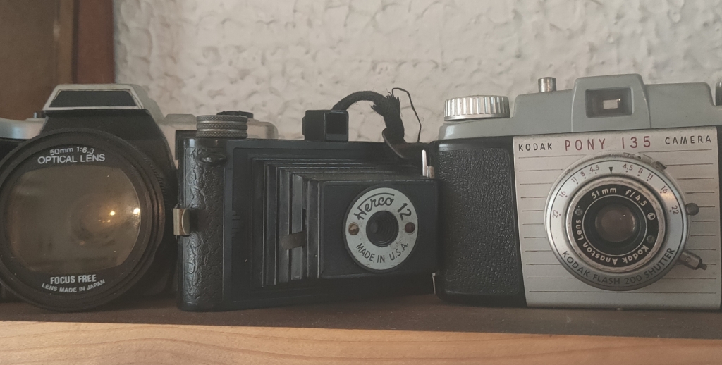 Sobre els prestatges hi ha exposades antiguitats del segle passat. Una màquina d’escriure, fotografies d’eventualitats, mobles robustos, etc. El que em fascina de debò són la varietat de càmeres analògiques exhibides, cada una més curiosa que l’anterior. Algunes d’elles són preparades per treure la fotografia impresa al moment, com les Polaroid o Kodak. Càmeres grans i petites amb lents de tot tipus.